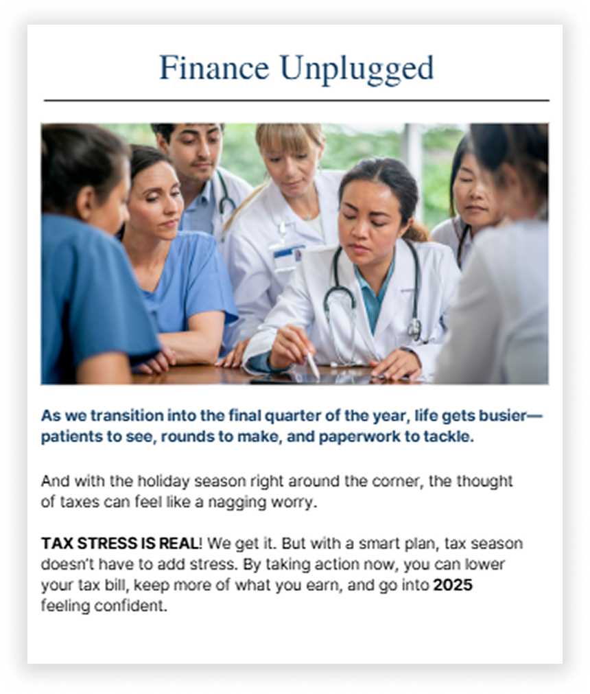 We also host monthly virtual seminars for residents, attendings, and medical teams, covering topics like debt management, taxes, investing, and long-term planning to help physicians build confidence in their financial decisions over time.